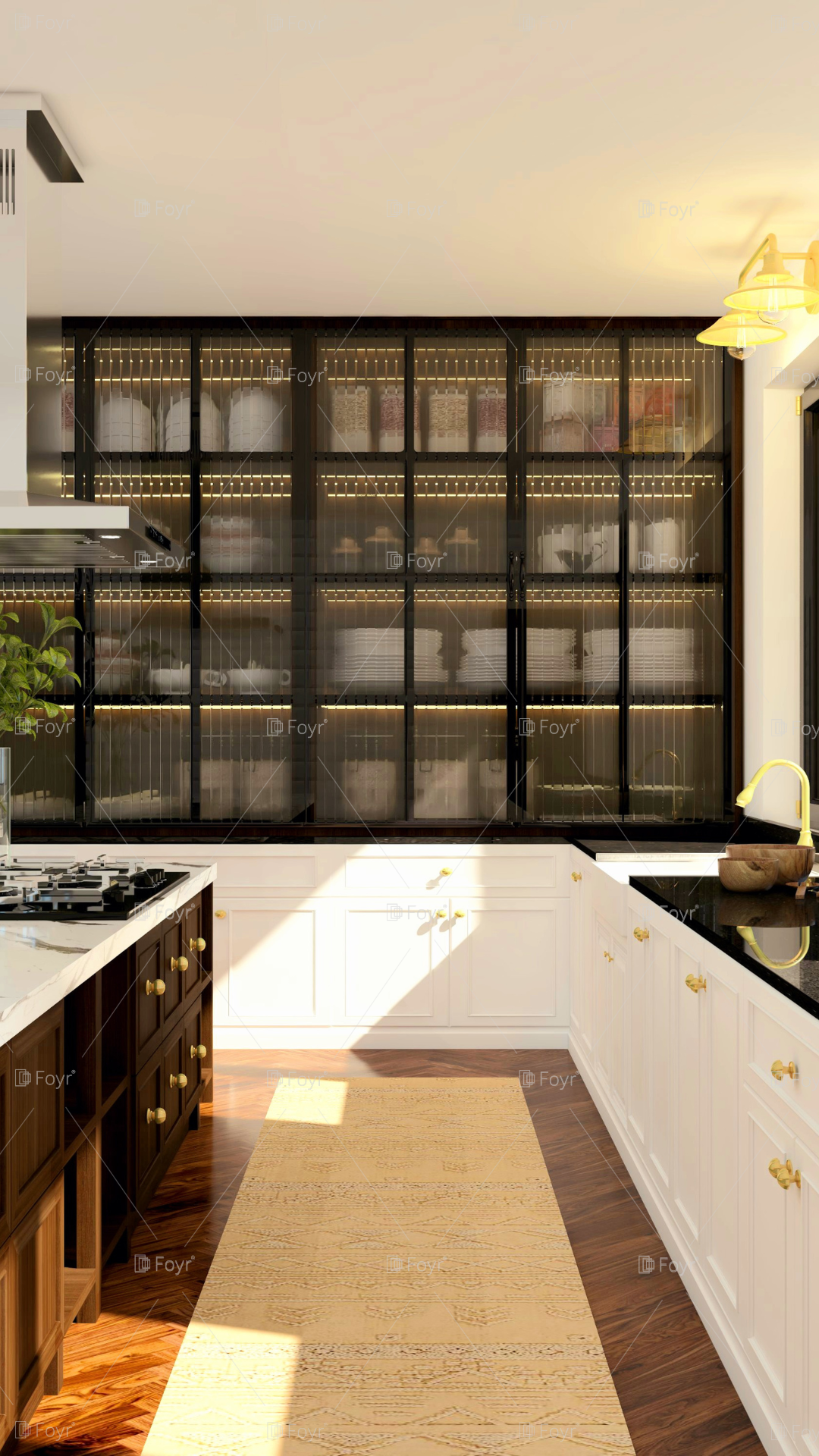 Elegant Transitional Kitchen with Glass-Front Pantry and Brass Accents