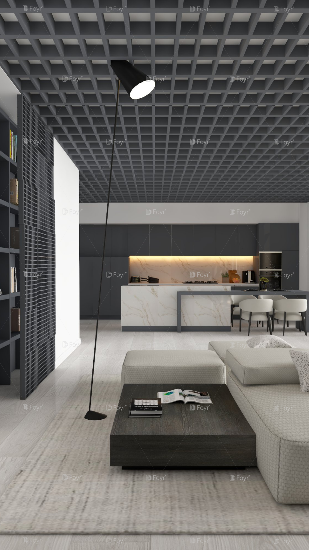 High-Contrast Urban Loft with Grid Ceiling Detail