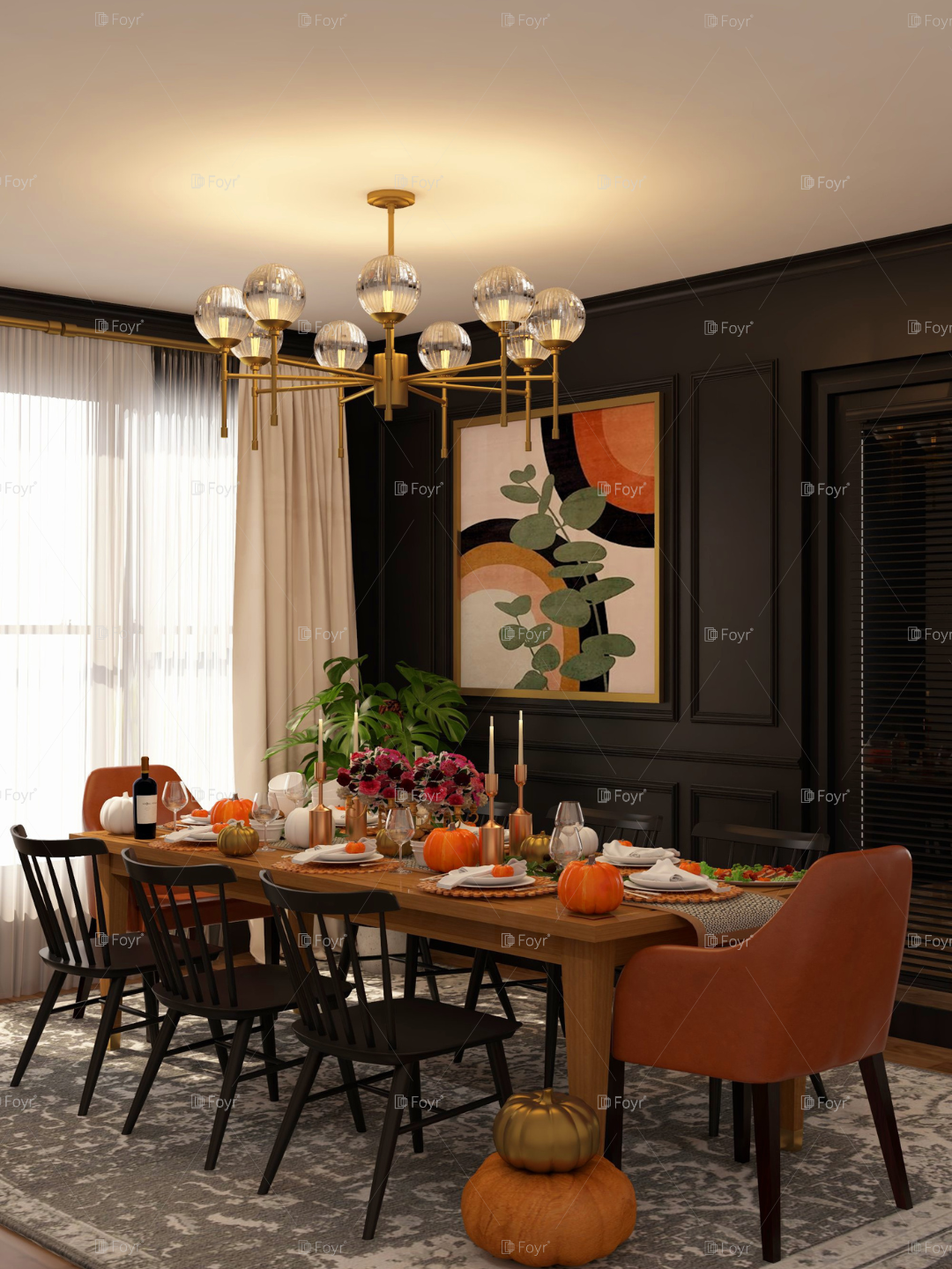 Modern Fall-Inspired Dining Room with Moody Walls and Pumpkin Accents
