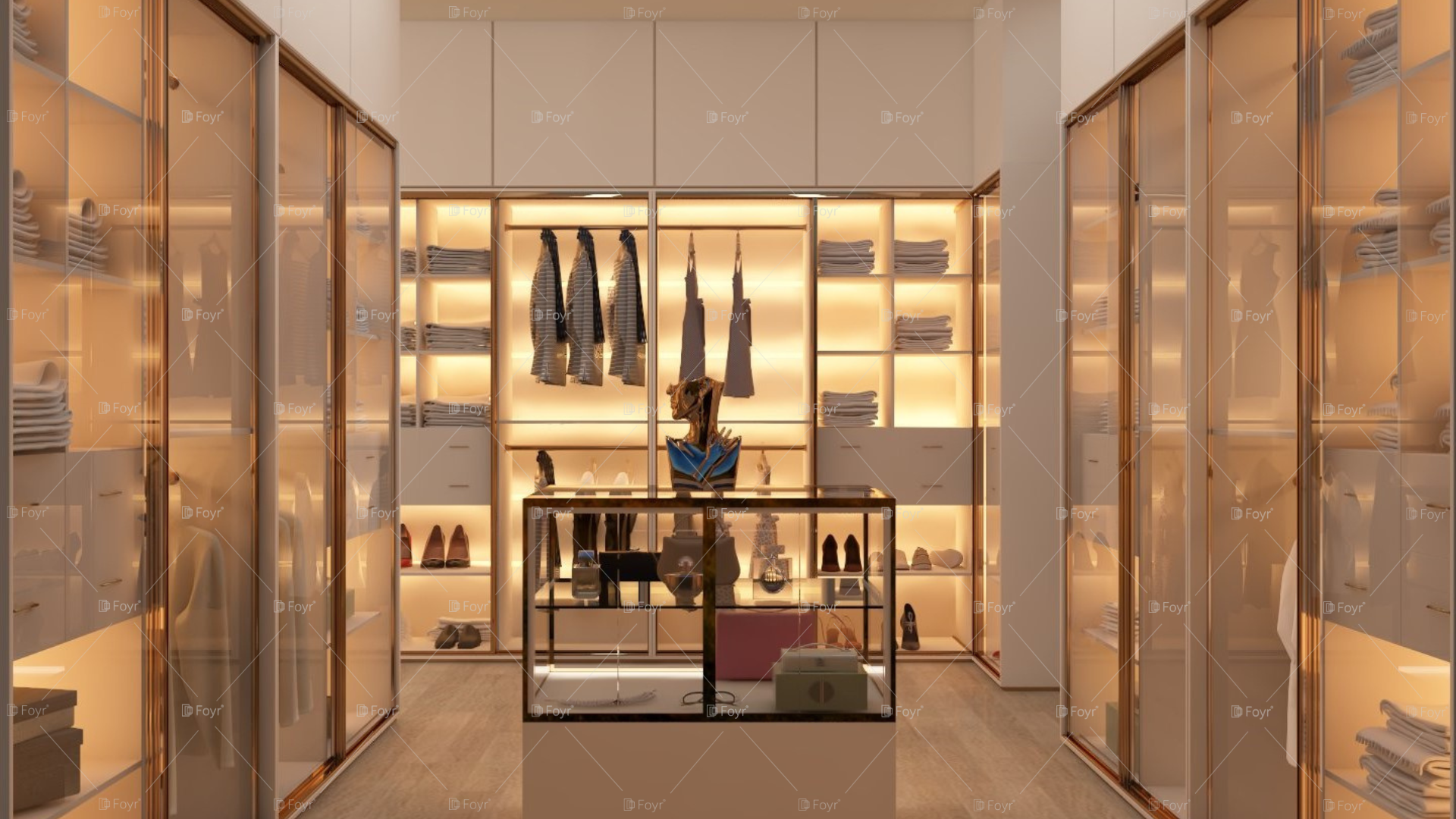 Bright Walk-In Closet with Rose Gold Framing and Display Island
