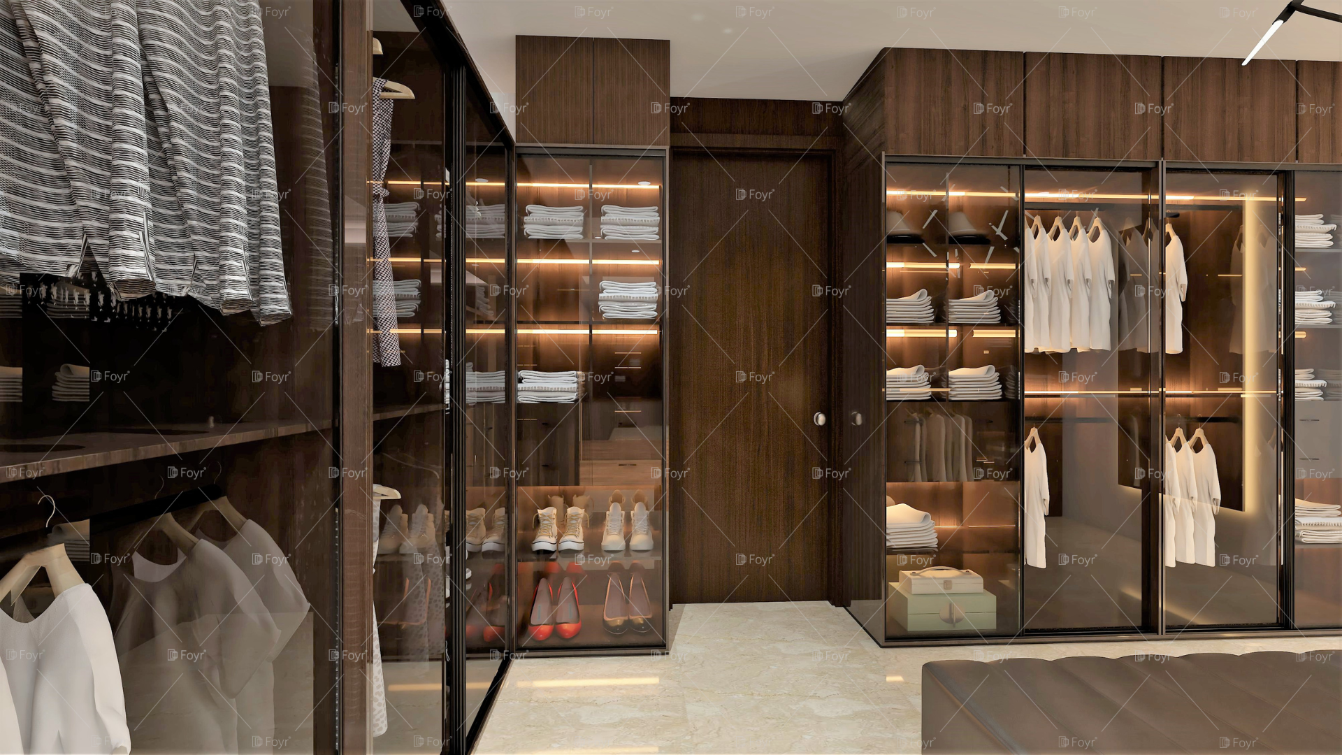 Dark Wood Walk-In Closet with Glass Doors and Ambient Lighting