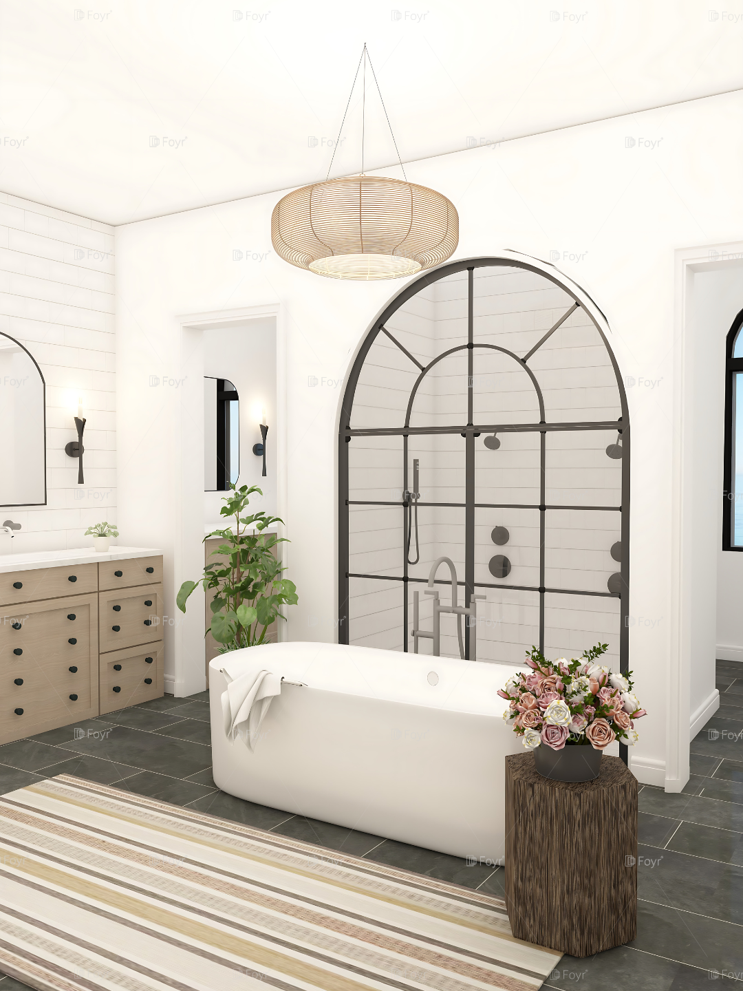 Vibrant and compact, this bathroom showcases playful orange and green tones alongside retro-inspired patterned tiles. Circular mirrors, soft lighting, and open shelving add charm and utility, making it an expressive space that doesn’t compromise on functionality.