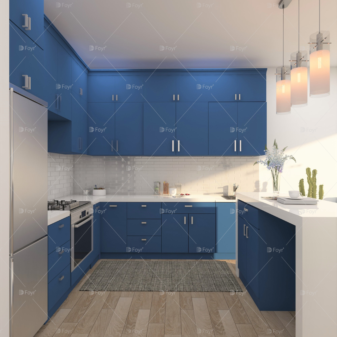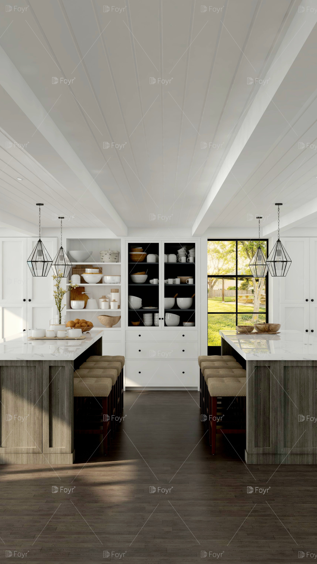 Sleek, functional, and visually warm — this kitchen features clean white cabinetry and a show-stopping marble waterfall island. Black accents through pendant lights and hardware add sophistication, while open shelves and wood floors keep the space grounded and welcoming.