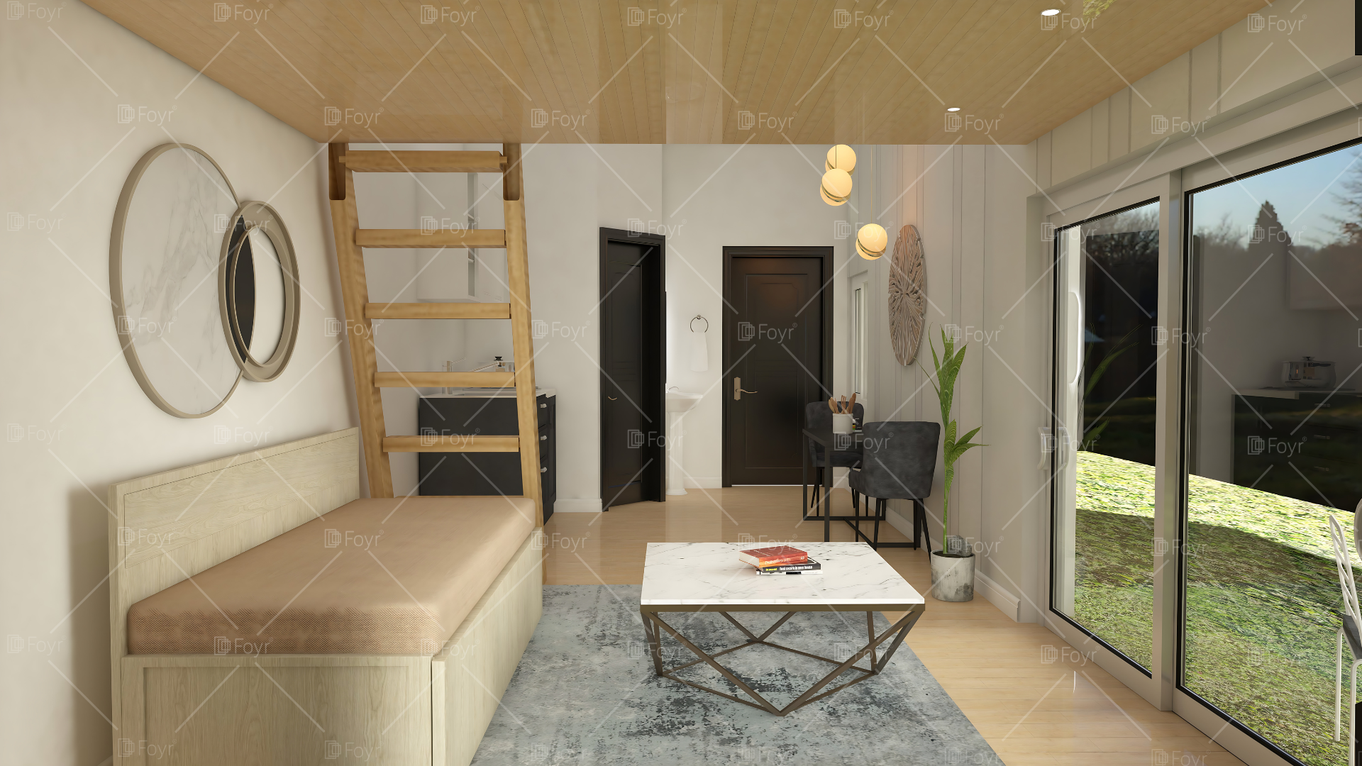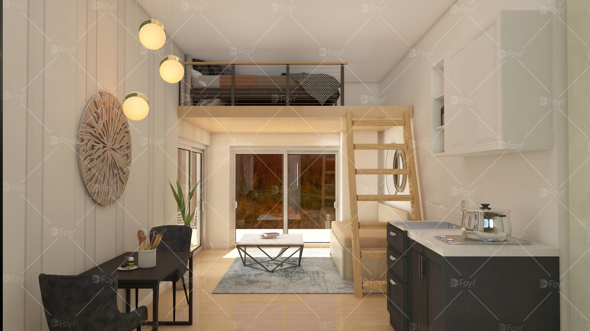 This charming modern-minimalist tiny house features a thoughtfully designed open space that combines a compact kitchen, cozy dining nook, and bright living area. Light wooden flooring and white walls create an airy, spacious ambiance enhanced by large glass doors that open to a lush outdoor view. The sleek kitchen offers functional cabinetry with minimalist finishes, while the built-in loft accessible via a wooden ladder adds extra sleeping or storage space. Contemporary pendant lighting and natural accents, such as indoor plants and textured wall art, complete the warm, refined aesthetic of this efficiently designed modern retreat.
