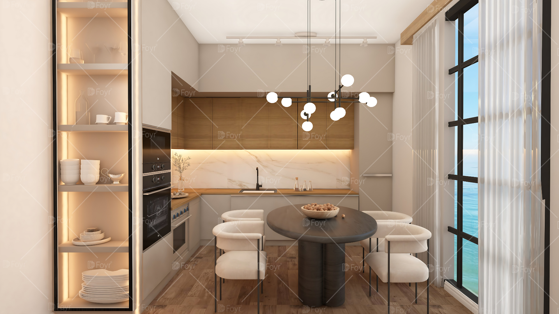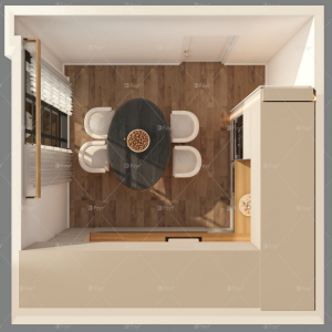 This compact modern kitchen combines warmth and simplicity with a sleek, space-efficient layout. A long countertop with integrated cabinetry and a matte black sink creates a clean, functional workspace. The warm wood textures of the flooring and countertop contrast beautifully with the minimalist white cabinetry. At the center, a small oval dining table with four sculptural chairs forms an inviting dining nook near a large window that floods the space with natural light. Perfect for apartments or small homes, this kitchen embodies Scandinavian elegance and practicality.
